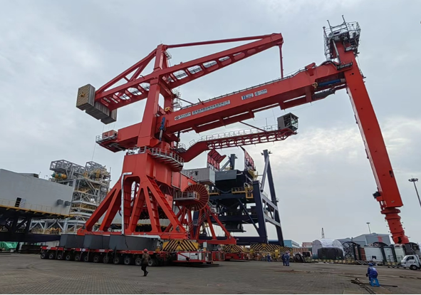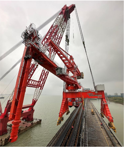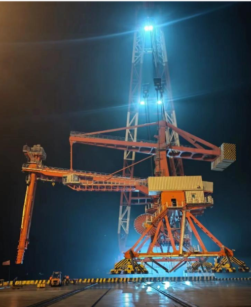 為不影響業(yè)主碼頭的正常生產(chǎn),自11月16日從華新機電張家港碼頭總裝場地開始,在項目組的科學(xué)統(tǒng)籌謀劃下,工作人員加班加點,克服了大雨、夜間作業(yè)的困難,鼓足干勁,經(jīng)過四天三夜連續(xù)工作后,將該臺螺旋卸船機安全地運至業(yè)主碼頭并成功吊裝就位,后續(xù)將在短暫的現(xiàn)場調(diào)試后開始投入試運行。