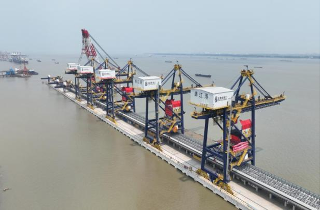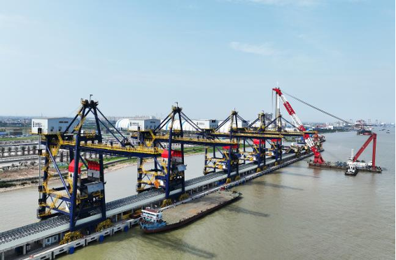 6月2日下午位于靖江經(jīng)濟(jì)技術(shù)開發(fā)區(qū)的深國(guó)際智慧物流中心碼頭5#卸船機(jī)上部結(jié)構(gòu)在浮吊的精細(xì)操作下,與下部結(jié)構(gòu)平穩(wěn)“對(duì)接”,順利完成拼裝。