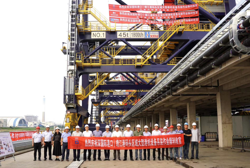 靖江項(xiàng)目主碼頭布置5臺(tái)卸船機(jī)和3臺(tái)裝船機(jī),卸船機(jī)高約59米,單機(jī)額定效率1800t/h,總重量約1350噸,是目前長(zhǎng)江沿線卸煤生產(chǎn)效率最高、外形尺寸及整機(jī)重量最大、自動(dòng)化程度最好的抓斗卸船機(jī)。裝船機(jī)額定效率為5400t/h(2臺(tái))、3000t/h(1臺(tái))。卸船機(jī)和裝船機(jī)對(duì)設(shè)備料斗部分采取了特殊措施,提高設(shè)備的環(huán)保性,并分別配置了高精度動(dòng)態(tài)計(jì)量斗和高精度整列式皮帶秤,為打造智慧、綠色、高效、安全項(xiàng)目提供堅(jiān)實(shí)的硬件基礎(chǔ)。