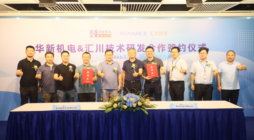 2023年7月12日,江蘇蘇州,杭州華新機(jī)電工程有限公司和蘇州匯川技術(shù)有限公司舉行了研發(fā)合作協(xié)議簽署儀式,華新機(jī)電副總經(jīng)理沈策和匯川技術(shù)重工裝備SBU總裁王小杰作為雙方代表,在華新機(jī)電總經(jīng)理王吉如和匯川技術(shù)聯(lián)合創(chuàng)始人、匯川書院院長張衛(wèi)江的見證下,簽署了雙方在“電力系統(tǒng)裝備國產(chǎn)化關(guān)鍵技術(shù)研發(fā)”的戰(zhàn)略合作協(xié)議。
