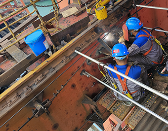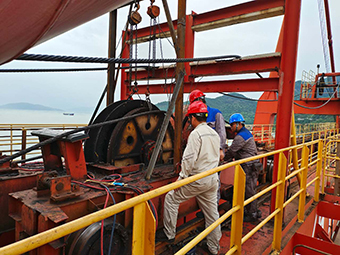 面對(duì)工期緊張、來船靠泊、連續(xù)降雨等不利因素,項(xiàng)目團(tuán)隊(duì)第一時(shí)間和業(yè)主溝通準(zhǔn)備入場(chǎng)資料,連夜組織協(xié)調(diào)施工人員趕赴現(xiàn)場(chǎng),迅速制定施工“作戰(zhàn)圖”,打通施工通道,組織平行作業(yè),盡全力保證各項(xiàng)工作有序開展,最終提前半天完成3號(hào)卸船機(jī)大臂鉸接點(diǎn)軸承及主小車滑輪組更換工作。
