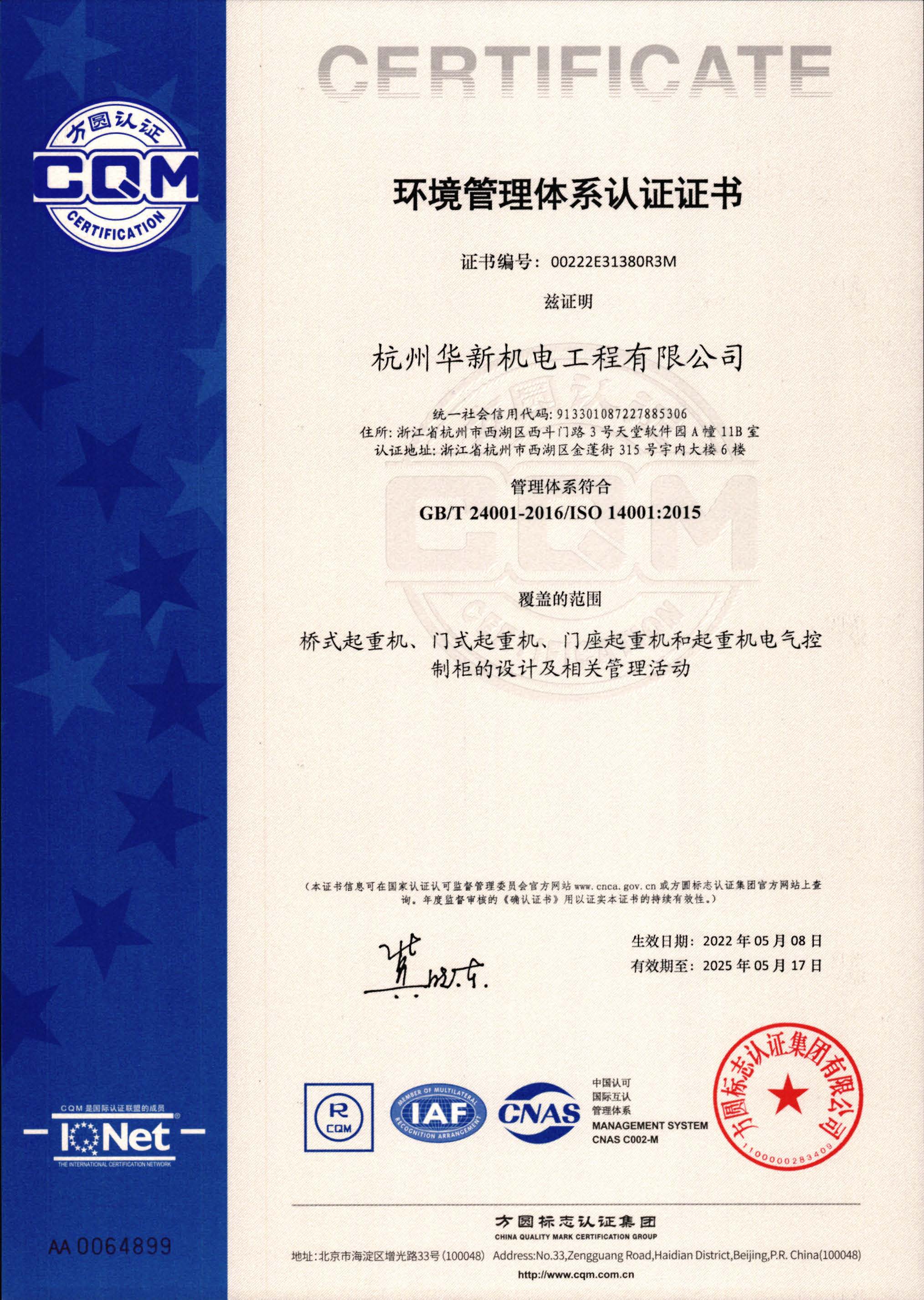 環(huán)境管理體系認證證書