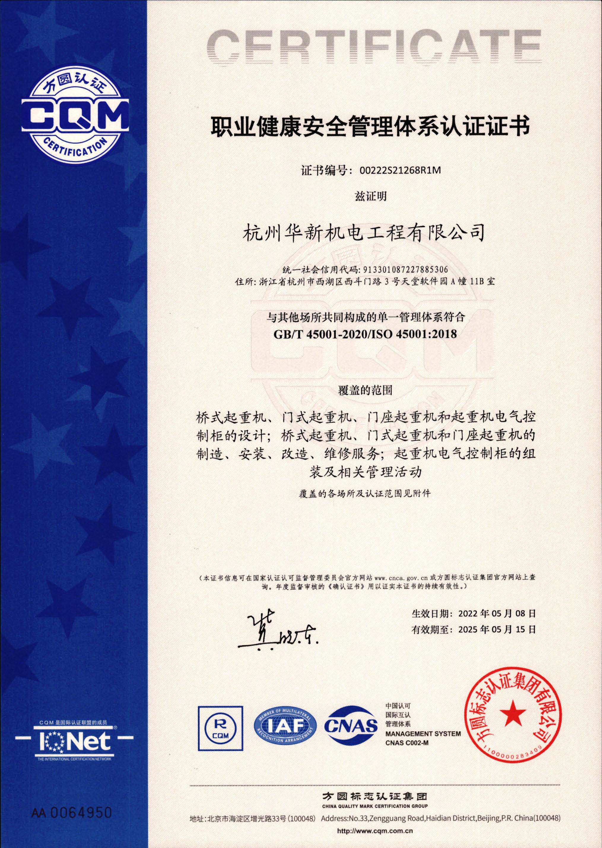 職業(yè)健康安全管理體系證書